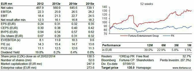 Ze zisku v roce 2013 Fortuna podle očekávání Erste vyplatí dividendu 0,29 EUR, ze zisku v roce 2014 pak 0,31 EUR. Sázení přes internet by mohlo být novým spouštěčem růstu, na druhou stranu se však zdá, že povolení v zemích, kde Fortuna operuje, je otázkou několika let.