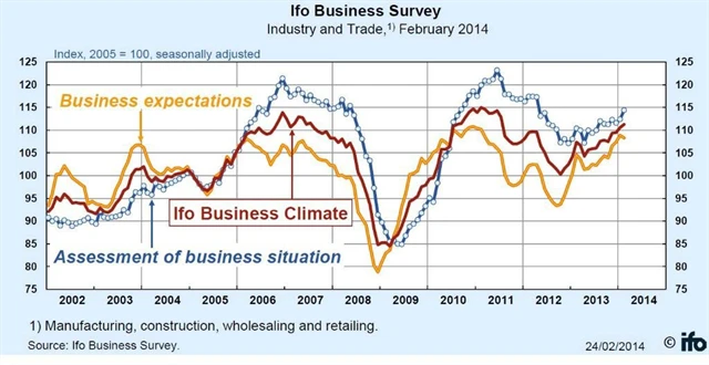 Index podnikatelské nálady se v únoru zvýšil na 111,3 bodu a ocitl se nejvýše od července 2011. Výsledky překonaly odhady analytiků v anketě agentury Bloomberg, kteří čekali, že index klesne na 110,5 bodu. Hodnota indexu odráží postoj představitelů přibližně 7 000 firem z celého Německa.