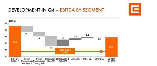 Zisk EBITDA klesl ve 4Q2013 o 16 % na 17,8 miliardy Kč.