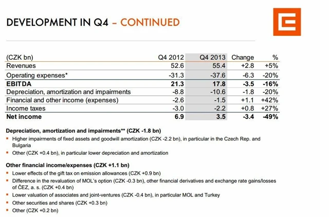 Zisk za 4Q2013 vykázal ČEZ v souladu s očekáváním (3,5 miliardy Kč). Tržby ve stejném čtvrtletí vzrostly firmě o 5 % na 55,4 miliardy Kč. Pro rok 2014 odhaduje firma zisk EBITDA 70,5 miliardy Kč, čistý zisk odhaduje 27,5 miliardy Kč.