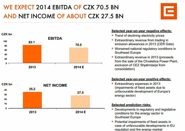 "Hlavní příčinou meziročního poklesu je výrazné snížení velkoobchodních cen elektřiny v důsledku masivní podpory obnovitelných zdrojů energie spolu se stagnací ekonomiky v Evropě a nejistotou ohledně regulatorních podmínek v energetice. Pro rok 2014 ČEZ očekává EBITDA 70,5 miliardy Kč a čistý zisk přibližně 27,5 miliardy Kč," uvedla firma.