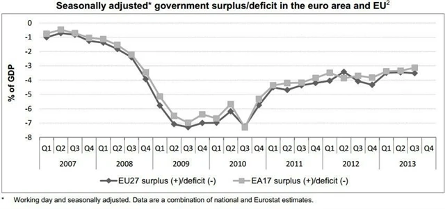 Ve třetím čtvrtletí roku 2013 klesl deficit rozpočtu eurozóny na 3,1 % HDP z 3,3 % HDP ve druhém čtvrtletí. Zároveň je tak nejníže od roku 2008. V celé evropské osmadvacítce deficit mírně vzrostl na 3,5 % z 3,4 % ve druhém kvartále.