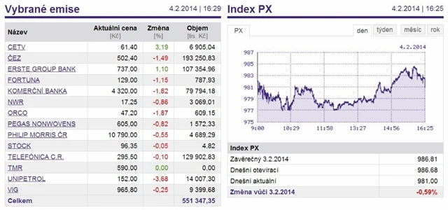 Pražská burza v úterý oslabila třetím dnem v řadě. Index PX klesl o 0,59 %.