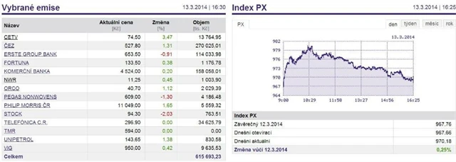 Pražská burza ve čtvrtek poprvé v tomto týdnu rostla, index PX posílil o 0,25 % na 970,18 bodu, když růst ceny akcií ČEZ a Komerční banky převážil nad poklesem cenných papírů Erste Bank.