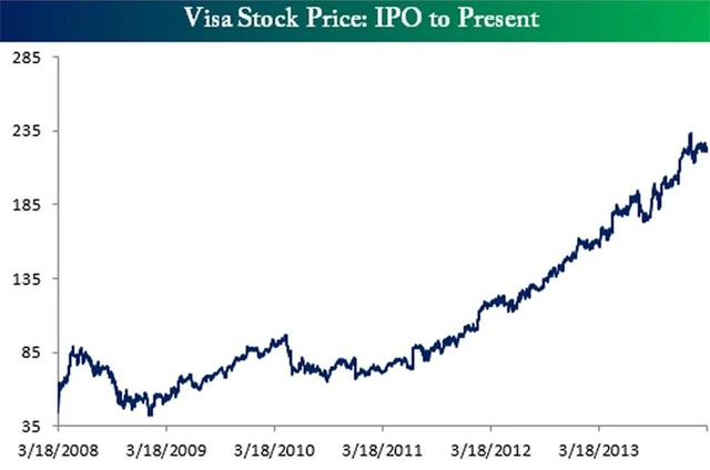 Společnost Visa v úterý oslavila 6 let veřejného obchodování. Rekordní IPO (19 miliard USD) zahájilo spanilou jízdu titulu, který za 6 let přidal 409 %.