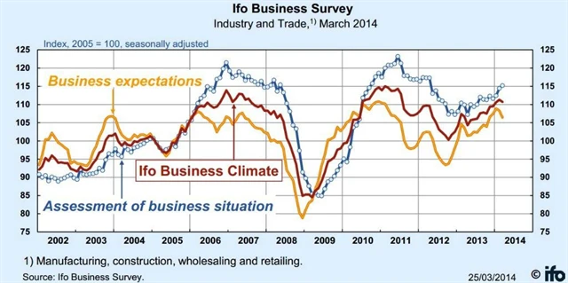 Nálada mezi podnikateli v Německu v březnu poprvé po pěti měsících klesla kvůli obavám z vývoje na Ukrajině a možnému dopadu sankcí na obchod Evropské unie s Ruskem. Index Ifo, který je založen na průzkumu mezi 7 tisíci manažerů, v březnu klesl na 110,7 bodu po únorových 111,3 bodu, což představovalo nejlepší výsledek od července 2011.
