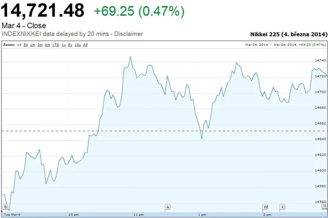 Situace na Ukrajině se přes noc nevyhrotila, Rusko prozatím nezaútočilo, přestože se objevily v pondělí večer spekulace o údajném ultimátu, které měli Rusové dát ukrajinským lodím na Krymu. Investoři v Asii také vyčkávají na sjezd Národního lidového kongresu, který by měl zasednout ve středu.