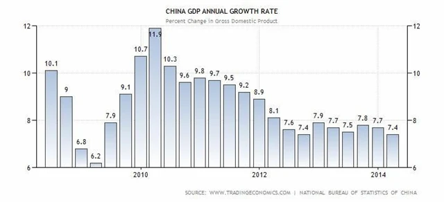 Ke konci roku 2013 čínské hospodářství rostlo o 7,7 % za rok (revize z původně oznámených 7,8 %). Aktuální tempo růstu je nejnižší za rok a půl. "Růst sice zpomalil, ale není to tak špatné, jak se mnozí obávali," uvedl Louis Kuijis, hlavní ekonom RBS pro Čínu, který za celý rok čeká růst HDP Číny o 7,7 %, tedy nad cílem vlády 7,5 %.