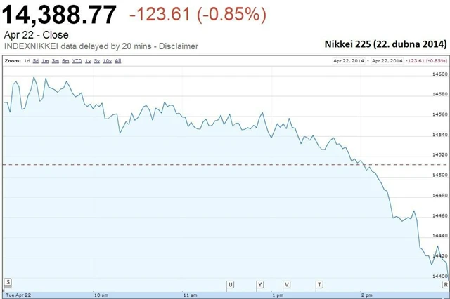 Japonský Nikkei smazal předchozí zisky a spadl na týdenní minimum poté, co jen zpevnil vůči dolaru z dvoutýdenního minima 102,71 USD/JPY, na něž v dubnu spadl. Dříve v průběhu seance Nikkei posiloval díky zprávě, že vláda plánuje celkovou revizi státního penzijního fondu, největšího na světě, ve prospěch rizikovějších investic prosazovaných premiérem Šinzó Abem a ve snaze omezit závislost na vládních dluhopisech.
