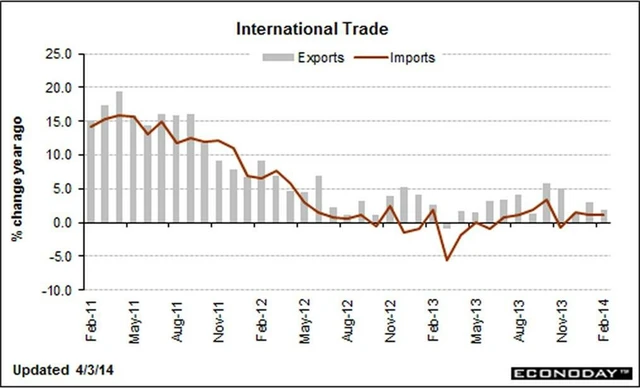 Vývoz do Číny klesl v únoru o 4,6 %, zatímco dovoz z této země se propadl o 19,5 %, což snížilo politicky citlivý deficit obchodu USA s Čínou na nejnižší hodnotu od března 2013. Pokles dovozu pravděpodobně způsobily oslavy nového lunárního roku v Číně.