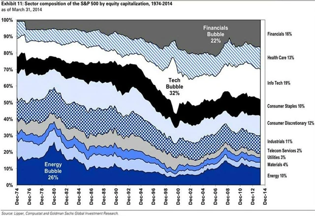 Ten ukazuje sektorové složení indexu S&P 500 podle tržní kapitalizace od roku 1974. Je zjevné, že sektorové bubliny se ukazují ve chvíli, kdy masivně naroste jejich podíl v indexu.