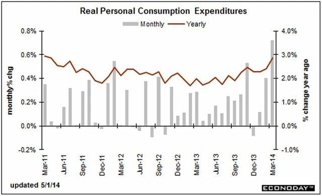 Osobní příjmy ve Spojených státech v březnu překonaly odhady - vzrostly o 0,5 % oproti konsenzu 0,4 %. Osobní výdaje vyskočily o 0,9 %, nejvíce od srpna 2009 a o 0,3 procentního bodu více, než se čekalo.