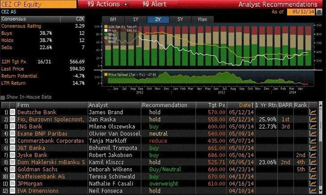 Přehled doporučení na akcie ČEZ, jak je sesbírala agentura Bloomberg: