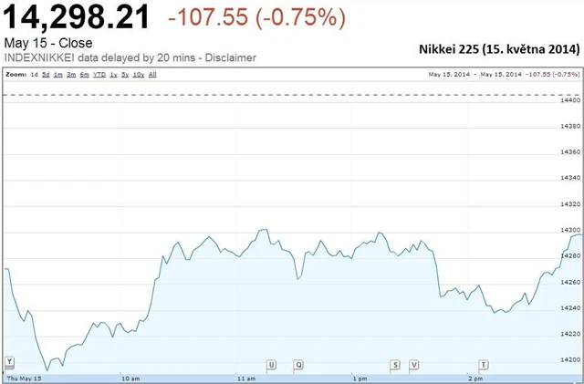 Nikkei odepsal 0,75 %, přes procento odevzdaly akcie v Číně (Shanghai Composite -1,12 %), zatímco Hongkong se pohyboval nad nulou se ziskem 0,4 %. Lehce posílil i australský S&P/ASX 200 (+0,26 %), zatímco jihokorejský Kospi zakončil na nule z mírnou ztrátou 0,03 %.