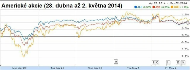 Americké akcie v pátek přišly o počáteční mírné přírůstky, kterých dosáhly díky překvapivě silným údajům z domácího trhu práce, a uzavřely celkově úspěšný týden mírným poklesem. Vliv údajů o zaměstnanosti smazala eskalace napětí na Ukrajině a sesuv akcií farmaceutického sektoru. Index Dow oslabil o 0,22 % na 16,522,33 bodu, S&P 500 klesl o 0,14 % na 1 881,11 bodu, když se během dne podíval i nad 1 890 bodů, a Nasdaq ztratil 0,09 % na 4 123,90 bodu.