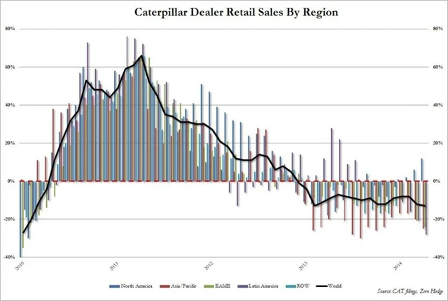 Výrobce těžebních a stavebních strojů Caterpillar oznámil, že jeho prodeje v dubnu klesly již 17. měsícem v řadě, tentokrát o 13 %. Největší pokles prodejů firma zaznamenala v Latinské Americe. O více než dvacet procent ale spadly také prodeje v Asii a v regionu Evropy, Afriky a Středního východu (EAME). Růst prodejů společnost naopak zaznamenala v Severní Americe, což lze podle analytiků interpretovat jako jasný důkaz pokračujícího oživování amerického hospodářství.