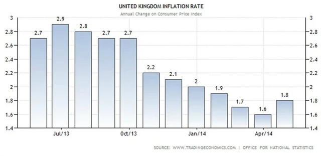 Inflace ve Spojeném království v dubnu zrychlila na 1,8 % z březnových 1,6 % meziročně, očekávalo se jen 1,7 %. Meziměsíčně se spotřebitelské ceny zvýšily o 0,4 % po březnovém přírůstku o 0,2 %, analytici vyhlíželi 0,3% růst. Jádrová inflace zrychlila dokonce na 2 % z 1,6 % v březnu. Růst cen domů se v březnu podle zveřejněné zprávy zpomalil na 8 % meziročně z únorových 9,2 % - v Londýně se meziročně ceny domů zvýšily o 17 % (v únoru +17,8 %).