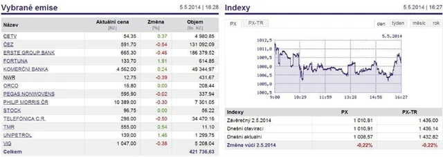 Index PX v pondělí odepsal 0,22 % na 1 008,57 bodu.