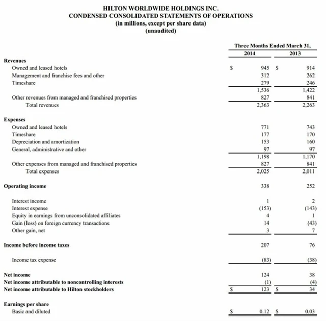 Výsledky Hilton Worldwide v 1Q2014: Zisk na akcii 0,12 USD (loni: 0,03 USD), upravený zisk na akcii 0,13 USD (odhad: 0,09 USD), tržby 2,363 miliardy USD