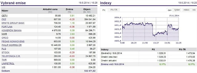 Objem obchodování ve čtvrtek přesáhl půl miliardy a největší podíl na něm měly akcie skupiny ČEZ, které však ztratily čtvrt procenta. Naproti tomu bankovním titulům se dařilo - Komerční banka zpevnila o 0,39 % a Erste Group Bank o 1,16 %.