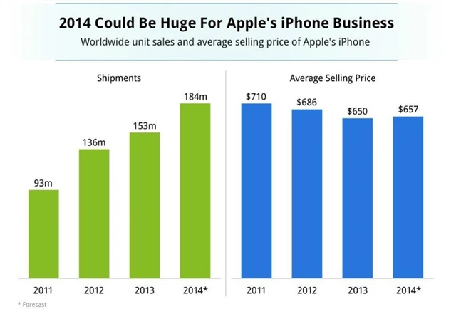 Graf ukazuje růst prodeje iPhonů a vývoj jejich ceny. Je očividné, co v grafu chybí - efekt iPhonu 6, který by měl přijít na trh na podzim. Nový iPhone s velkým displejem by měl v významně zvýšit prodeje i ceny.