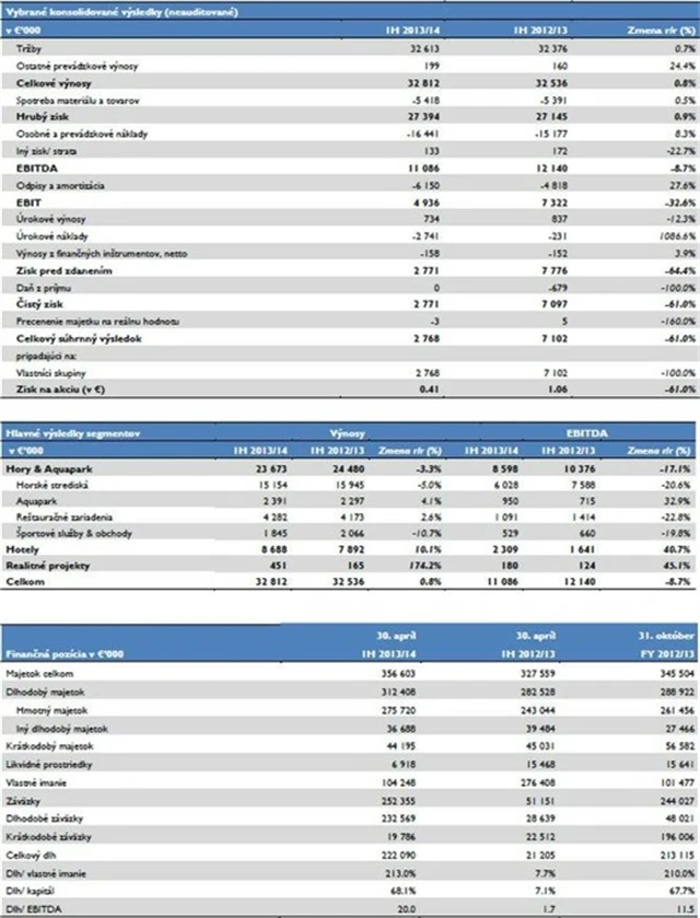 Ukazatel EBITDA meziročně klesl převážně kvůli provozním nákladům, které se zvýšily spuštěním nových lanovek ve Vysokých Tatrách a v Jasné Nízke Tatry na začátku zimní sezóny 2013/2014 kvůli otevření nových sjezdovek se zasněžováním a nových restauračních zařízení a obchodů. Pokles čistého zisku o 61 % na 2,8 milionu eur způsobily hlavně zvýšené úrokové náklady kvůli emisi dluhopisů v nominální hodnotě 180 milionů eur a čerpání bankovního úvěru. Zisk na akcii dosáhl 0,41 eura.