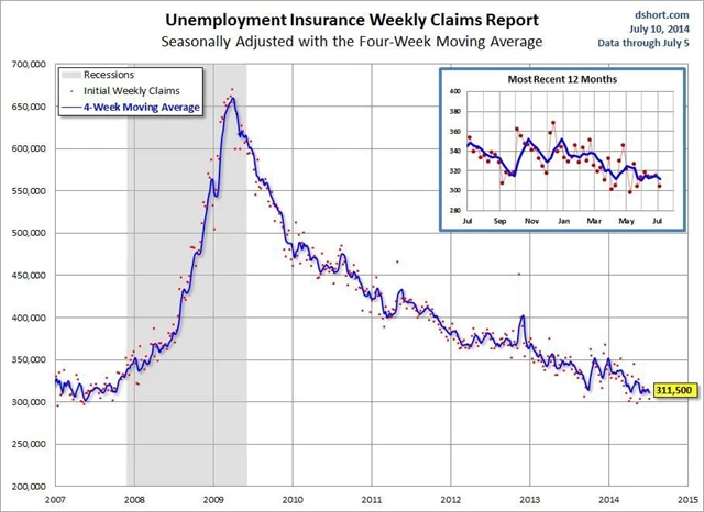 Týdenní počet nových žádostí o podporu v nezaměstnanosti v USA v týdnu do 5. července nečekaně klesl o 11 tisíc na 304 tisíc. Čekala se stagnace na původně hlášených 315 tisících nových žádostí z předchozího týdne. Čtyřtýdenní průměr klesl o 3,5 tisíce na 311,5 tisíce. Počet pokračujících žádostí vzrostl v týdnu do 28. června na 2,584 milionu z 2,574 milionu (revidováno z 2,579 milionu), očekávala se stagnace na původně hlášených 2,579 milionu.