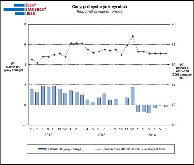 Česká republika: Ceny v průmyslu a zemědělství meziročně v červnu stále klesají