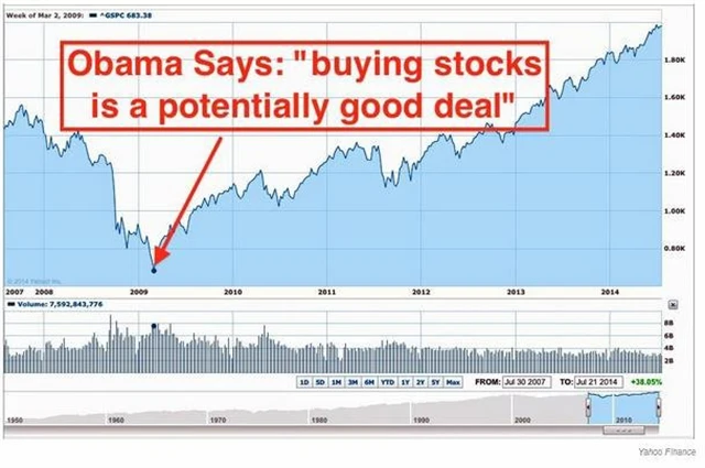 Stratég z Goldman Sachs David Kostin si vzpomněl na jiné vyjádření Obamy k akciím. Bylo to 3. března 2009, kdy americký prezident prohlásil: "Poměrové ziskové ukazatele se dostávají do bodu, kdy je nákup akcií z dlouhodobé perspektivy velmi dobrou příležitostí."