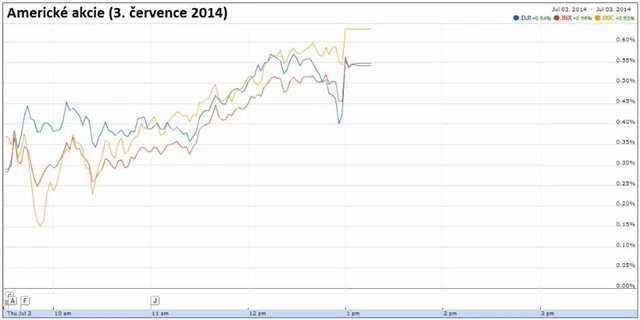 Americké akcie zahájily čtvrteční obchodování růstem, za kterým stály příznivé údaje o červnovém poklesu nezaměstnanosti ve Spojených státech na 6,1 %. Index Dow se navíc poprvé v historii přehoupl přes psychologicky významnou hranici 17 000 bodů. Obchodování na burzách NYSE i Nasdaq před pátečním volnem kvůli oslavám Dne nezávislosti skončilo netradičně již v 19.00 SELČ.