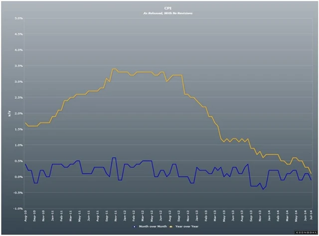 Meziměsíčně se však země propadla do deflace 2,1 % po růstu cen o 0,1 % v červnu (odhad: -1,8 %). Podle údajů neharmonizovaných s metodikou výpočtů EU se ceny v Itálii meziročně zvýšily o 0,1 % (odhad: +0,3 %, červen: +0,3 %) a meziměsíčně se snížily o 0,1 % (odhad: +0,1 %, červen: +0,1 %).