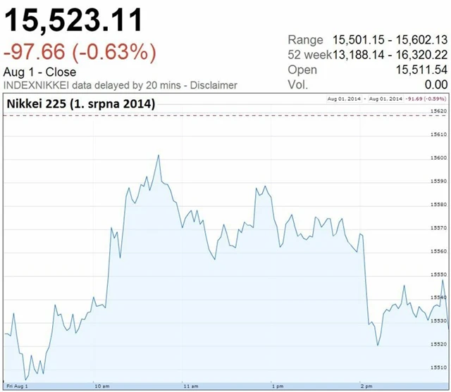Obchodování na asijských akciových číslech v závěru týdne skončilo v červených číslech. Burzy se tak vydaly ve stopách trhů v Evropě a Spojených státech, které taktéž výrazně oslabily. Většímu poklesu nicméně zabránila čínská makrodata, podle kterých se aktivita v tamním zpracovatelském sektoru mírně zvedla. Oficiální index Číny v červenci vzrostl na 51,7 bodu z 51,4 bodu v červnu.