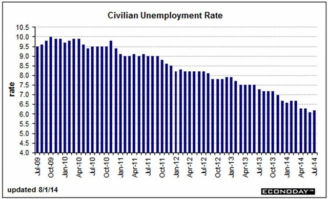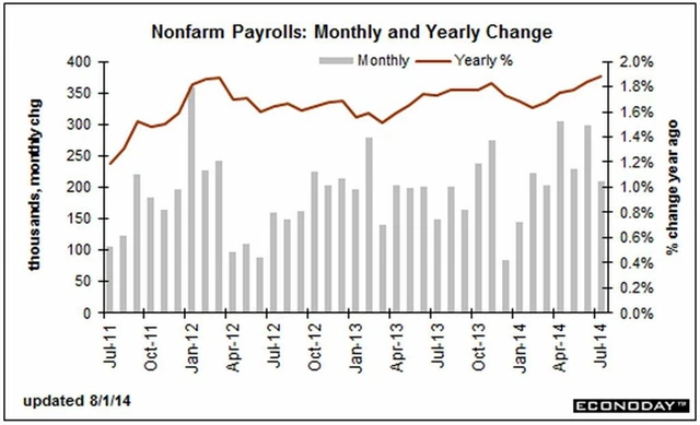 Americká ekonomika v červenci mimo zemědělství vytvořila 209 tisíc pracovních míst. Analytici oslovení agenturou Bloomberg očekávali přírůstek 230 tisíc míst po červnových 298 tisících (revidováno z 288 tisíc). Ekonomové nicméně upozorňují, že bylo již šestým měsícem v řadě vytvořeno více než 200 tisíc nových pracovních míst, což je pozitivní. Znamená to mimo jiné nejdelší sérii měsíčního růstu o 200 tisíc a více nových míst od roku 1997. Celková míra nezaměstnanosti vzrostla o desetinu procentního bodu na 6,2 %. Čekala se stagnace na předchozí úrovni 6,1 %.