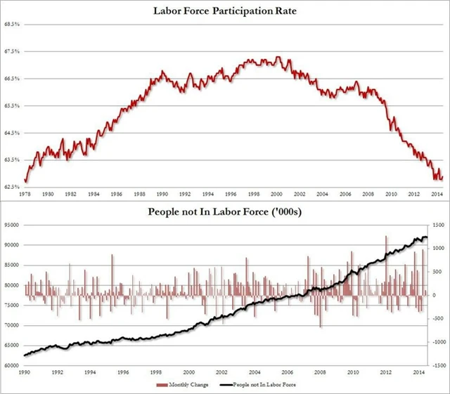 Průměrná hodinová mzda zůstala v červenci ve srovnání s červnem beze změny při očekávání mírného růstu o 0,2 %. Míra participace (podíl lidí hlášených v kategorii pracovních sil) sice mírně vzrostla o 0,1 procentního bodu na 62,9 %, stále se ale nachází na nejnižší úrovni od března 1978.