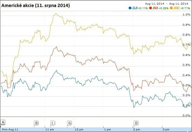 Americké akcie po pátečním výrazném oživení ze série ztrát v pondělí dále posilovaly. Investory povzbuzuje zmírnění napětí kolem Ukrajiny a snížení obav z přitvrzení americké měnové politiky. Dow v pondělí zpevnil o 0,10 %, S&P 500 o 0,28 % a technologický Nasdaq o 0,70 %. Nejlépe si v indexu Dow vedly akcie firem Intel, Caterpillar a Cisco Systems, ztrácely naopak cenné papíry společností ExxonMobil, American Express a Wal-Mart.