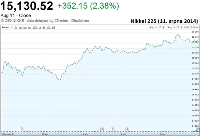 Japonský Nikkei zpevnil o 2,38 %, akciím exportérů pomáhal slábnoucí jen.