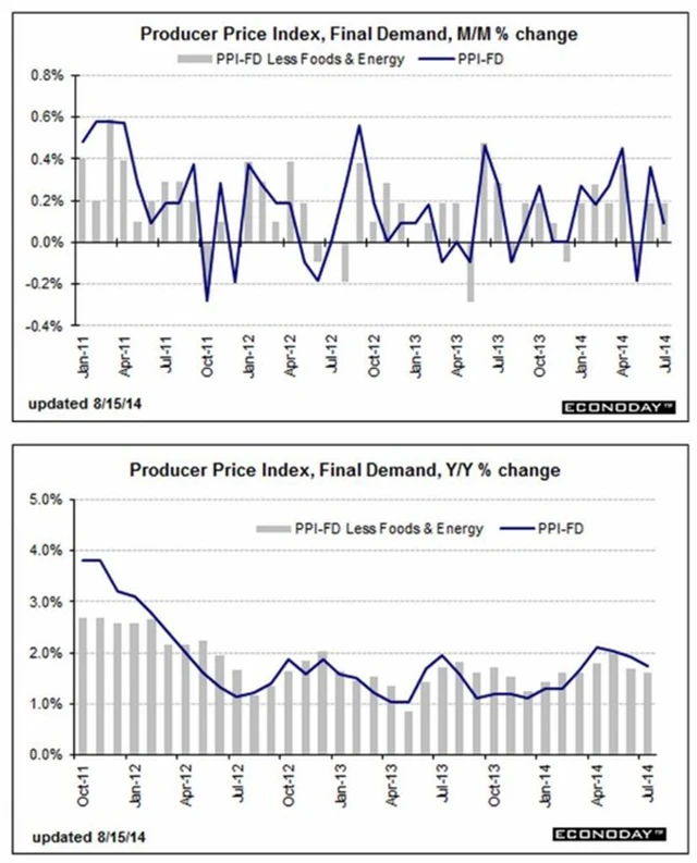 Americký index výrobních cen v červenci meziročně vzrostl o 1,7 %, meziměsíčně se zvýšil o 0,1 %. Čekal se meziroční růst o 1,8 % po růstu o 1,9 % v červnu. Tempo meziměsíčního růstu je v souladu s odhady. V červnu index meziměsíčně vzrostl o 0,4 %. Bez cen jídla a energií index meziročně vzrostl v souladu s odhady o 1,6 % (červen: +1,8 %) a meziměsíčně vzrostl taktéž v souladu s odhady o 0,2 % (červen: +0,2 %).