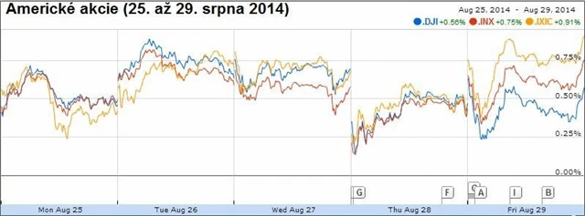 Akcie po zahájení obchodování nejprve ztrácely kvůli zprávě z Británie, která zvýšila stupeň ohrožení teroristickými útoky na druhý nejvyšší kvůli vývoji v Sýrii a Iráku. Nakonec však na trhu díky datům z ekonomiky převládla pozitivní nálada. Akcie se vrátily k růstu, který v týdnu přerušily obavy ohledně ukrajinské krize. V pondělí budou akciové trhy v USA kvůli státnímu svátku uzavřeny, objem obchodů byl v pátek před prodlouženým víkendem velice nízký.