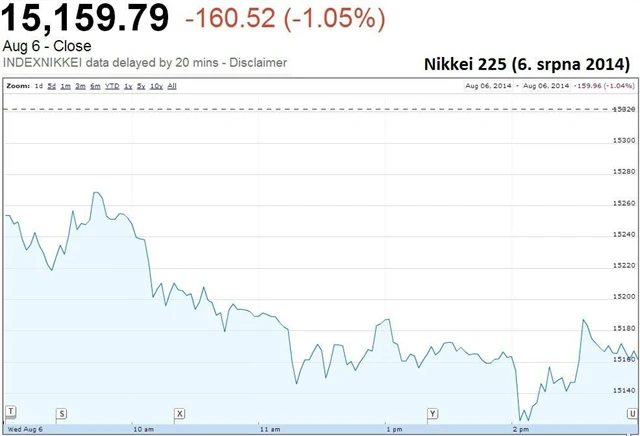 Japonský Nikkei ztrácel pátý den v řadě, odepsal 1,05 % a zakončil nejníže za posledních 6 týdnů. Akcie Toyota Motors oslabovaly o necelé procento navzdory tomu, že automobilka v úterý ohlásila 4,4% růst provozního zisku za druhé čtvrtletí a potvrdila svůj celoroční výhled. Cenné papíry SoftBank ztratily 3,5 % po zprávě, že společnost Sprint nejspíš upustí od záměru koupit T-Mobile kvůli problémům s regulativními pravidly.