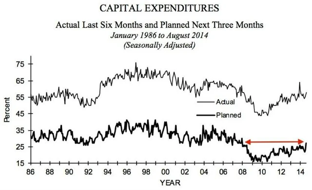 Kapitálové výdaje jsou podle průzkumu National Federation of Independent Business (NFIB) mezi malými podniky zpět na úrovních, na jakých se nacházely před recesí. Index optimismu malých podniků v srpnu podle zprávy vzrostl na 96,1 bodu, což je druhý nejvyšší výsledek od října 2007.