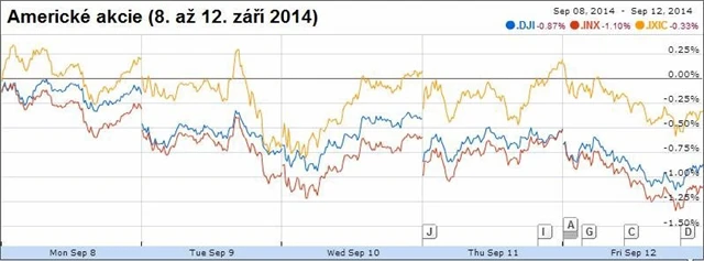 Investoři v pátek zvolili opatrný přístup k akciím. Příští týden rozhoduje FOMC o měnové politice, pokles cen ropy dolehl na akcie energetických firem, na čemž měly podíl nově zavedené sankce Západu proti Rusku. Hlavní indexy zažily první ztrátový týden od začátku srpna, americký dolar stoupl v páru s japonským jenem na nejvyšší hodnotu za šest let.
