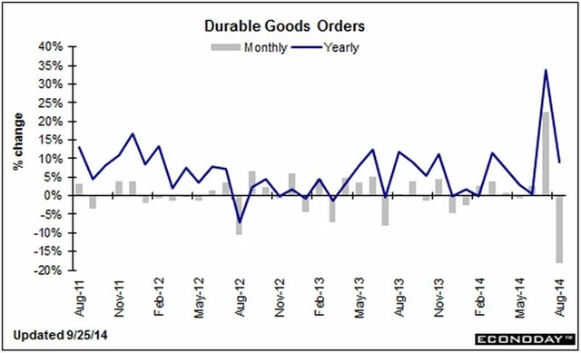 Objednávky zboží dlouhodobé spotřeby v srpnu ve Spojených státech meziměsíčně klesly o 18,2 %. Očekával se pokles o 17,1 %. V červenci se objednávky zboží dlouhodobé spotřeby v USA meziměsíčně zvýšily o 22,6 %. Bez započtení dopravních prostředků v srpnu objednávky v souladu s odhady po červencovém poklesu o 0,7 % (revidováno z -0,8 %) meziměsíčně o 0,7 % stouply.