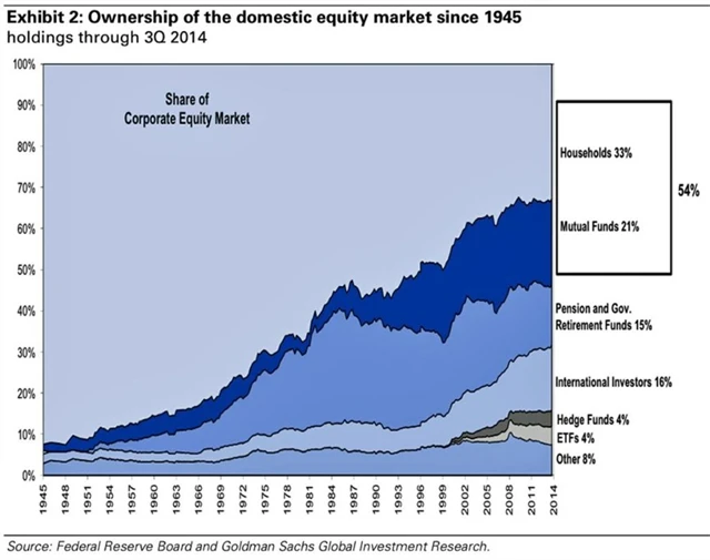Americký akciový trh je největší na světě. Více než polovinu trhu, tedy tržní kapitalizace, aktuálně okolo 23 bilionů USD) přitom "vlastní" domácnosti podílové fondy. V posledních letech pomalu získávají podíl hedgeové fondy (4 %) a ETF (4 %), zahraniční investoři drží asi 16 % kapitalizace amerického trhu. Třetí největší silou na trhu jsou tak penzijní a vládní důchodové fondy.