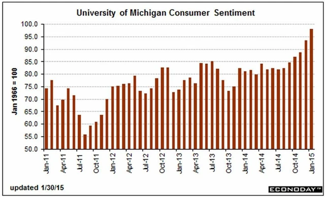 Důvěra amerických spotřebitelů v ekonomiku Spojených států v lednu dál rostla a dostala se na nejvyšší úroveň za posledních 11 let. Index spotřebitelské důvěry Michiganské univerzity v lednu podle finálních údajů vzrostl na 98,1 bodu z 93,6 bodu v prosinci. Předběžný odhad uváděl, že index vzrostl na 98,2 bodu.