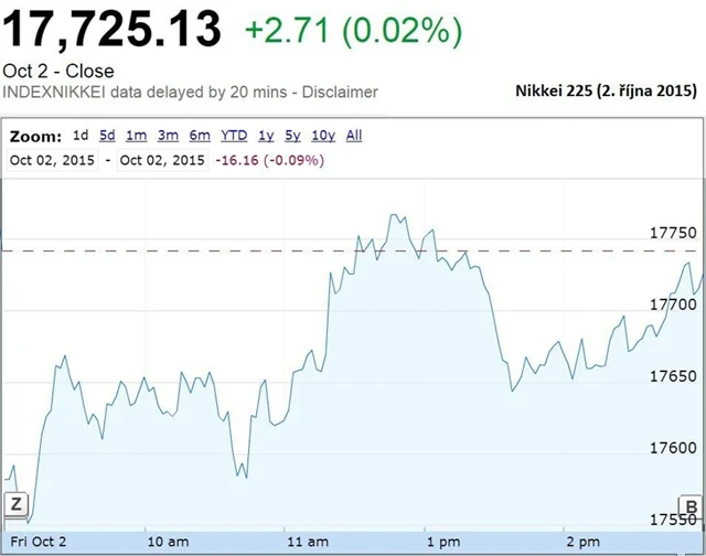 Japonský Nikkei 225 zakončil prakticky na zelené nule se ziskem 0,02 %, za celý týden odepsal 0,9 %. Dařilo se exportérským firmám, akcie společnosti Sony posilují už třetí den v řadě díky zvýšení doporučení ze strany Goldman Sachs na "kupovat". Náladu investorů podpořila i domácí makrodata - výdaje domácností v srpnu vzrostly meziročně o 2,9 %, analytici přitom očekávali jen 0,4% růst. Míra nezaměstnanosti ve stejném měsíci dosáhla 3,4 %, trh čekal 3,3 %.