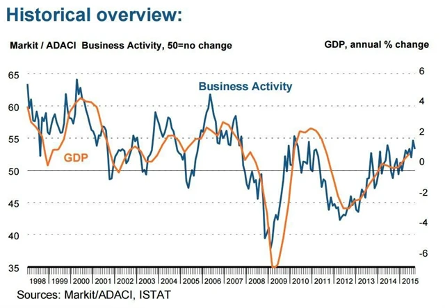 Index nákupních manažerů v sektoru služeb v Itálii v září klesl ze srpnových 54,6 bodu na 53,3 bodu, očekával se přitom jen mírnější pokles na 54,1 bodu. Produkce je stále solidní, přestože roste pomalejším tempem než v srpnu, navíc očekávání manažerů vzrostla na pětiměsíční maximum, avšak již podruhé za tři měsíce také klesla zaměstnanost. Kompozitní index se rovněž snížil, a to na 53,4 bodu z 55 bodů v srpnu.