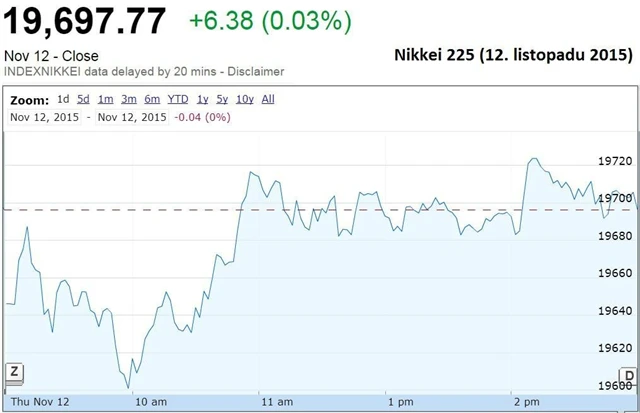 Japonský Nikkei 225 zakončil prakticky na nule se ziskem 0,03 % navzdory makrodatům, které ukázaly na oživování kapitálových výdajů. Jádrové objednávky strojů, které jsou považovány za předstihový indikátor kapitálových výdajů, v září vzrostly o 7,5 % po srpnovém propadu o 5,7 %. Tento meziměsíční údaj je však velmi volatilní, přestože nezahrnuje velké objednávky v energetickém a dopravním sektoru, které by mohly mít na výsledek disproporční vliv.