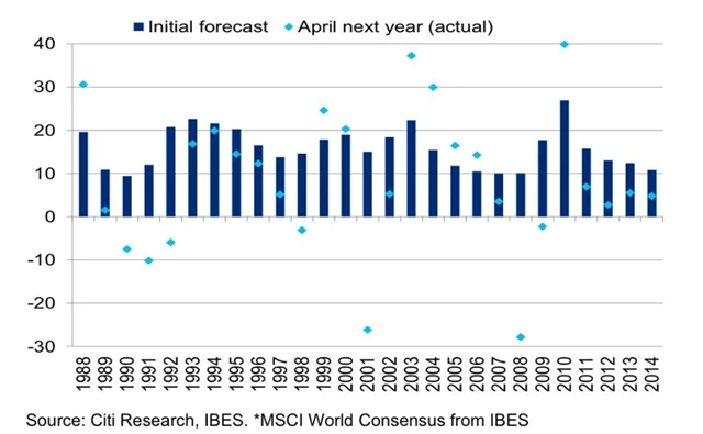 "Analytici jsou obvykle příliš optimističtí ohledně korporátních zisků," tvrdí Robert Buckland ze Citigroup. "Graf níže ukazuje jejich počáteční odhady (konsenzus) a skutečně dosažené výsledky na úrovni zisku na akcii až do roku 1988."