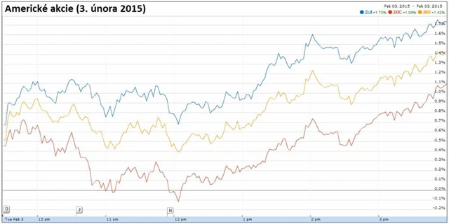 Dow posílil o 1,76 % na 17 666,40 bodu, širší S&P 500 přidal 1,44 % na 2 050,03 bodu a technologický Nasdaq uzavřel se ziskem 1,09 % na 4 727,74 bodu. Index volatility VIX spadl téměř o 11 % na 17,33 bodu a výnosy 10letých vládních dluhopisů USA vyskočily o jedenáct bazických bodů na 1,78 %.