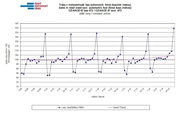 Sezónně očištěné tržby v maloobchodě včetně prodeje a oprav motorových vozidel (CZ-NACE 45+47) se snížily v prosinci reálně meziměsíčně o 0,4 %. Meziročně tržby očištěné o kalendářní vlivy vzrostly o 4,2 %, bez očištění se zvýšily o 5,9 %. Na zvýšení tržeb se podílel jak motoristický segment, tak samotný maloobchod. Meziroční vývoj byl ovlivněn také o jeden den vyšším počtem pracovních dní v prosinci 2014 oproti prosinci 2013.
